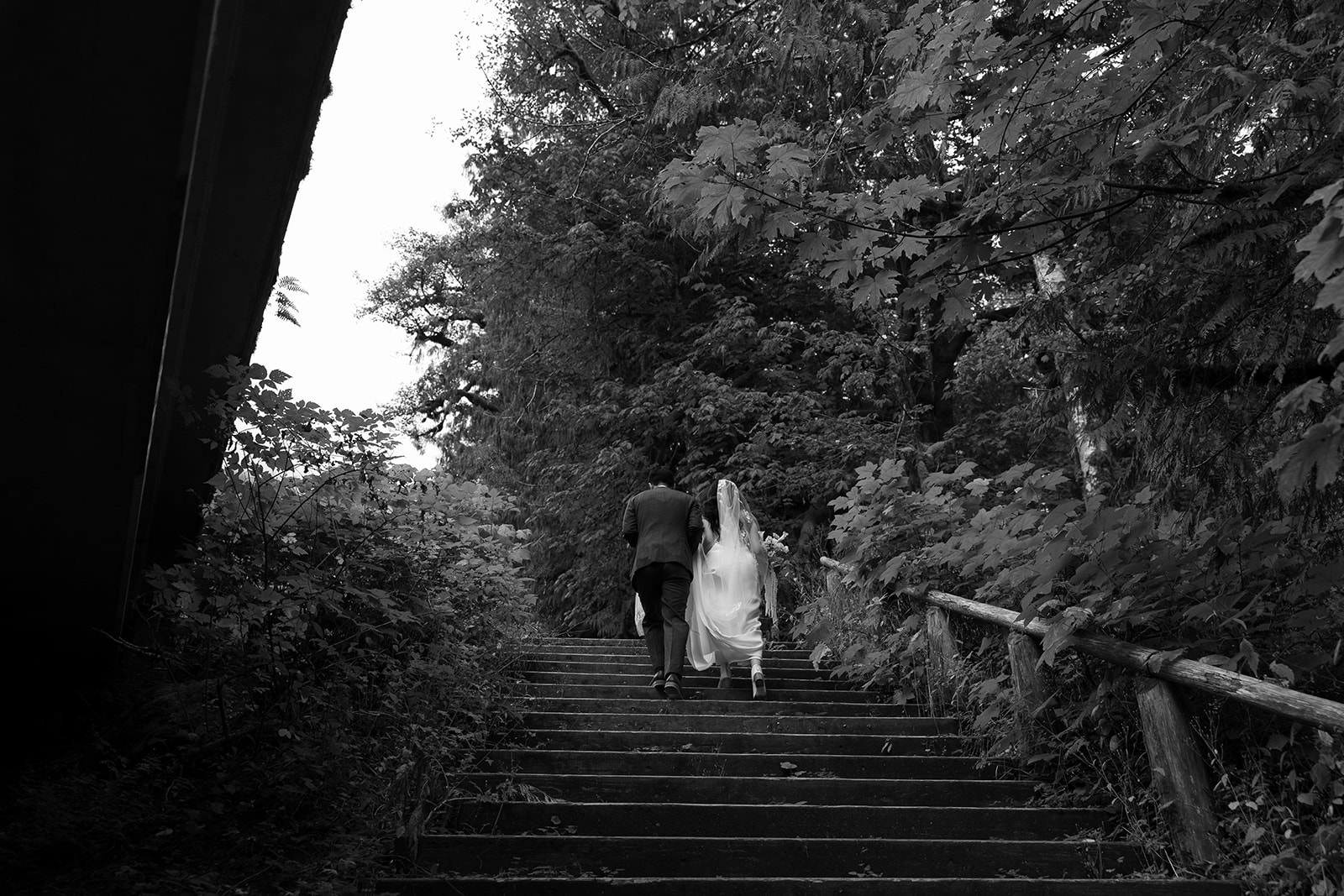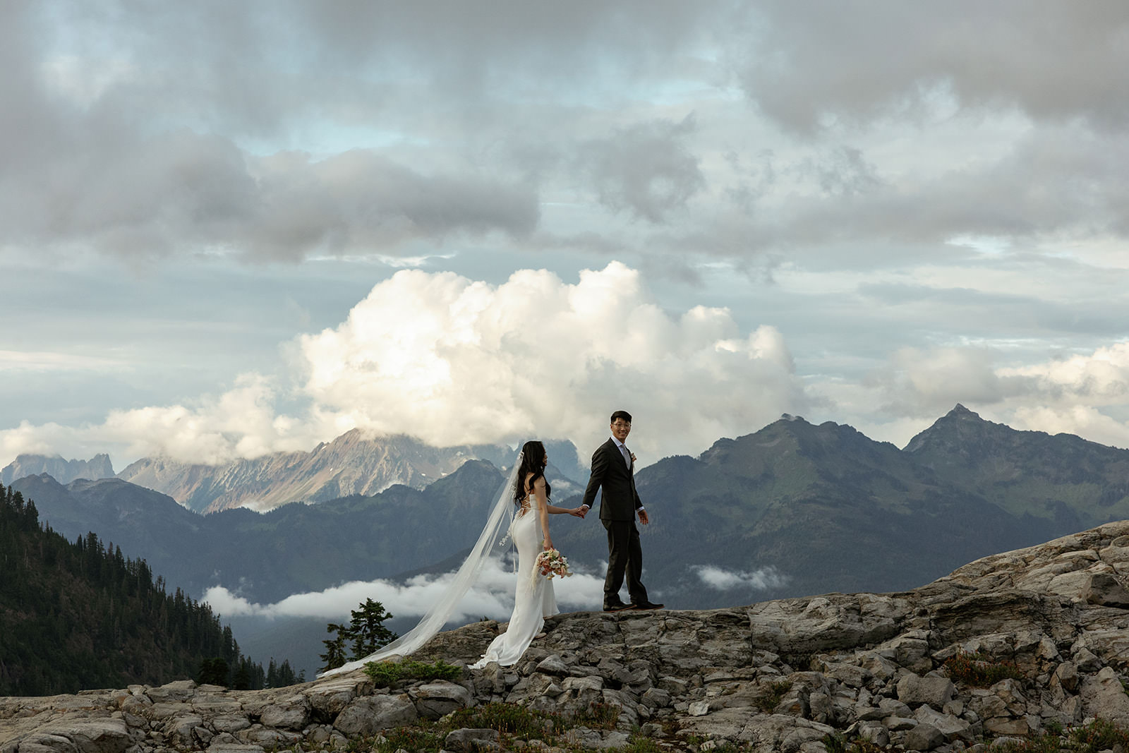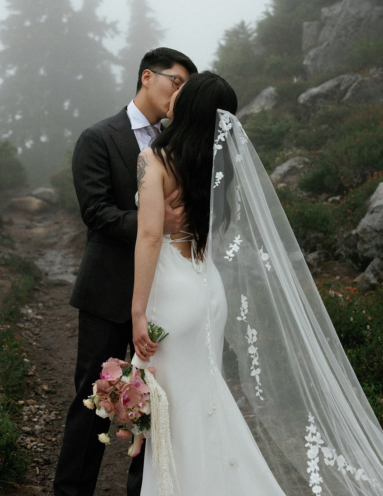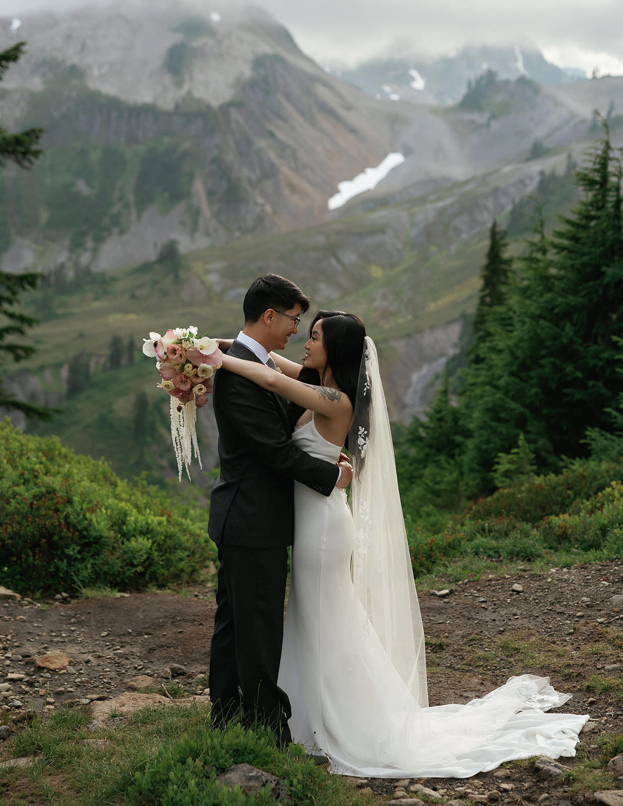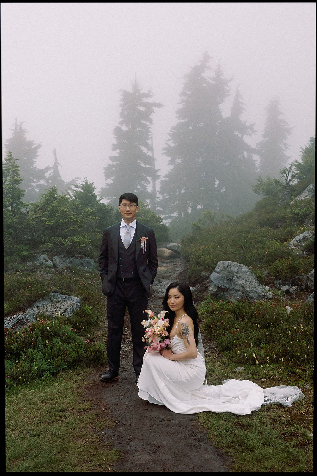 Ly wore a slip-style wedding dress that moved beautifully on the trail, practical enough for hiking but elegant enough for the images to feel bridal rather than casual. David kept it simple in a charcoal suit. The aesthetic was intentionally understated, letting the Pacific Northwest landscape do the heavy lifting.