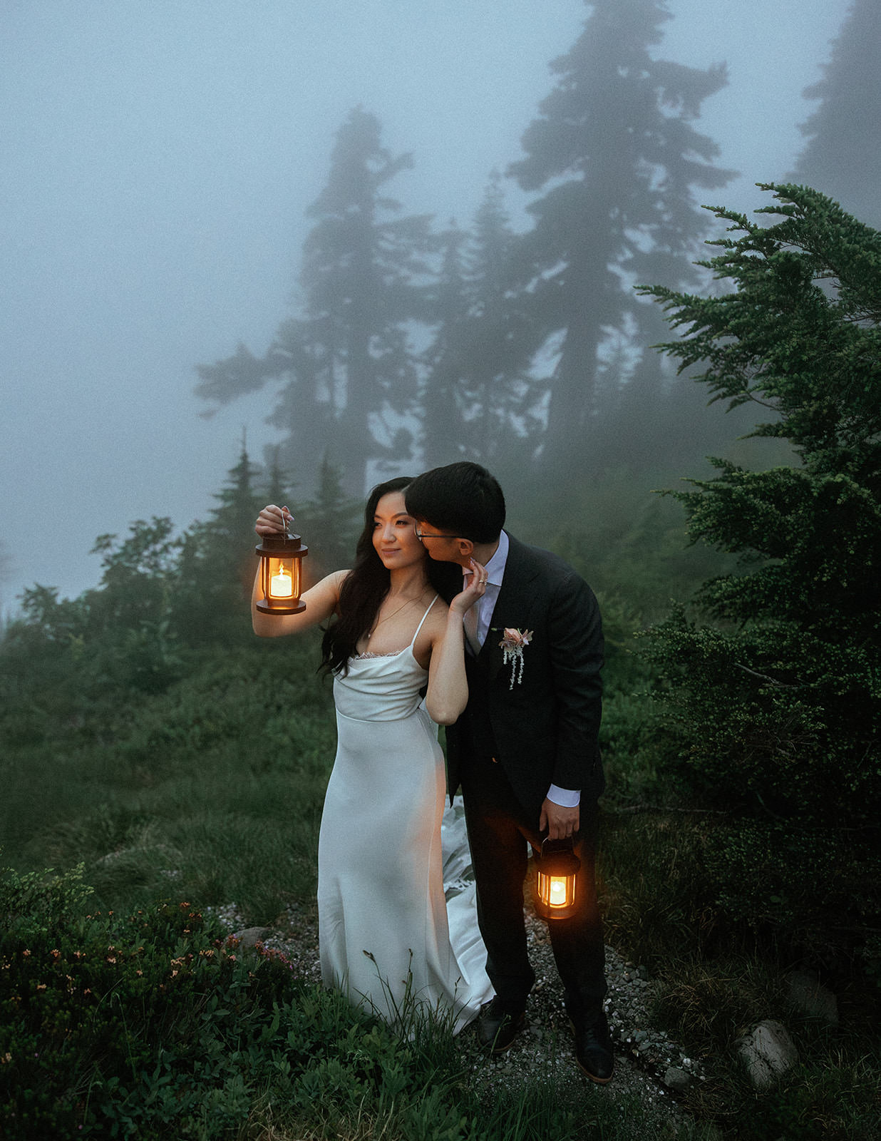 As light faded and fog rolled in across the alpine terrain, we ended the evening with lanterns on the hillside. The image of two people lit by candlelight against a wall of Pacific Northwest mist is one I’ll remember for a long time. There’s something about shooting an intimate mountain ceremony at Mt. Baker specifically that feels different from other alpine locations. The combination of accessible elevation, dramatic volcanic geology, and that signature Pacific Northwest weather creates images that feel both epic and quiet.
