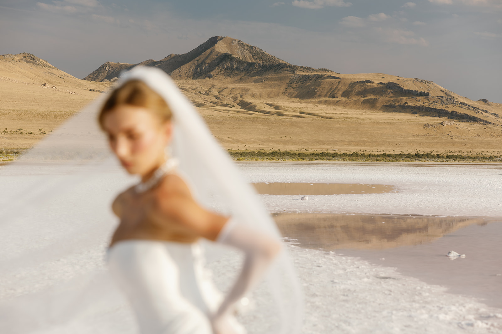Utah’s pink salt lake stands as one of the most visually arresting unique wedding locations and editorial bridal sessions. Located near the Great Salt Lake, this natural wonder transforms depending on seasonal conditions, algae levels, and mineral concentrations, creating an ever-changing canvas that ranges from soft blush to vibrant coral. What makes this location extraordinary for fashion-forward wedding photography is its alien, almost Martian quality. The landscape feels simultaneously familiar and completely otherworldly. Vast expanses of crystallized salt stretch toward mountain silhouettes, while shallow pink-tinted water reflects enormous skies. The textured salt formations create natural sculptural elements that add dimension and visual interest to every frame. Photographing at the pink salt flats requires understanding the unique challenges and opportunities of desert environments. The light here is spectacular but intense. Golden hour provides the most flattering conditions, with warm tones that complement the natural pink hues of the landscape. The salt surface itself acts as a massive natural reflector, bouncing light in ways that create an ethereal, almost glowing quality in images. The best times to visit for photography are typically spring and fall when temperatures are moderate and the water levels create the most dramatic pink coloration. Summer can be extremely hot, while winter may present access challenges. Weather patterns greatly influence the lake’s appearance, so flexibility in scheduling is essential for capturing the location at its most photogenic. For couples considering this location for their wedding, it’s important to work with a photographer experienced in both harsh lighting conditions and remote locations. The terrain, while beautiful, requires appropriate footwear (the salt can be sharp and uneven), and the remoteness means careful planning for all styling elements, vendors, and logistics. The pink salt lake offers something truly rare in wedding photography: a location that photographs unlike anywhere else on earth, yet feels romantic and dreamlike rather than harsh or industrial. It’s ideal for couples who want their images to feel like they could be from another world entirely, and it’s quickly becoming a go-to destination for wedding inspiration seekers looking for something beyond traditional venues.