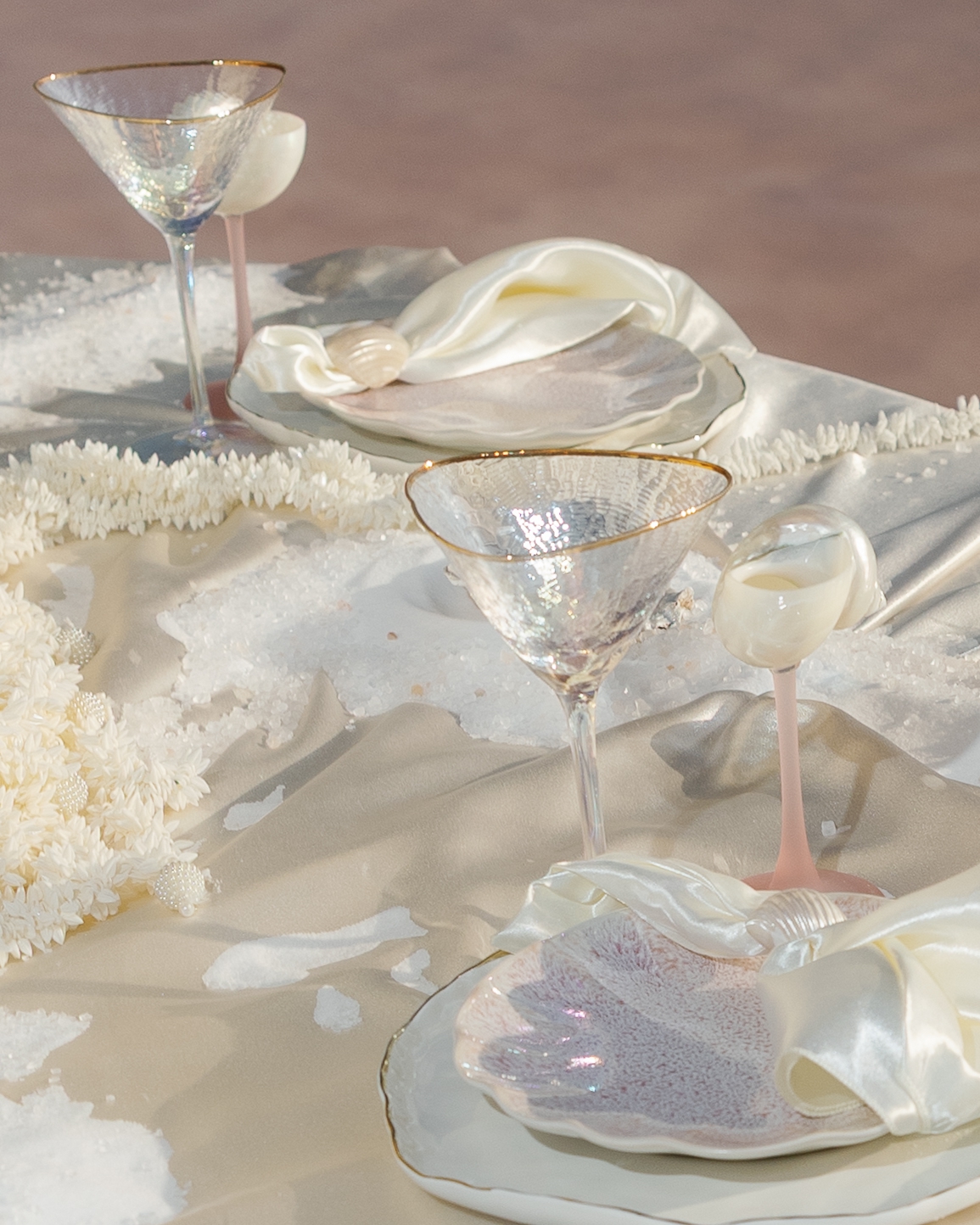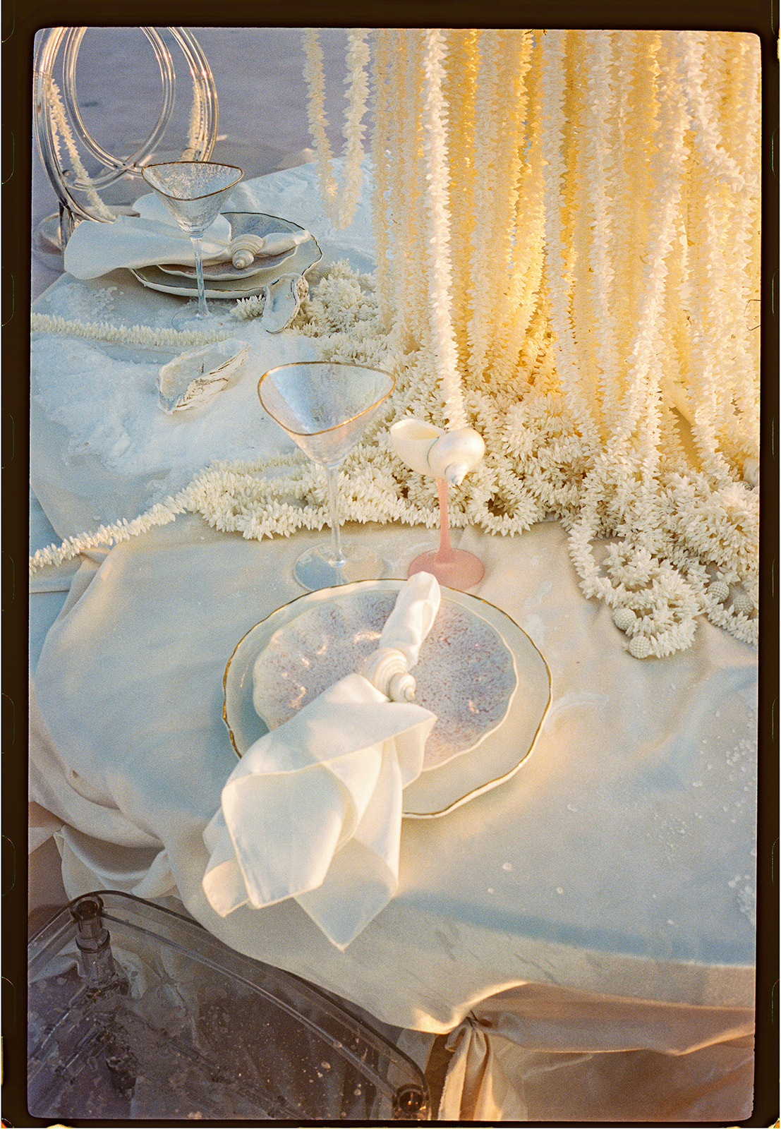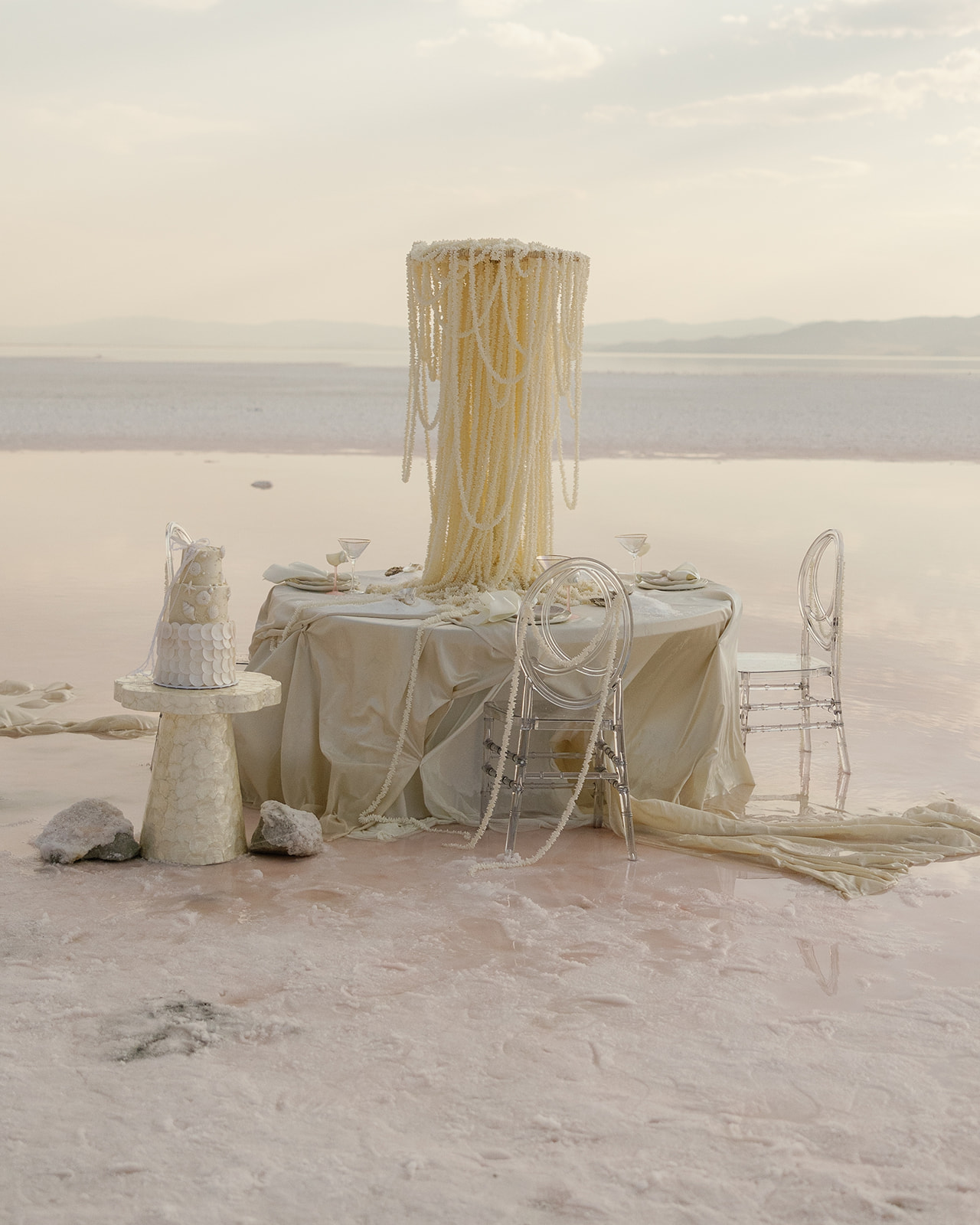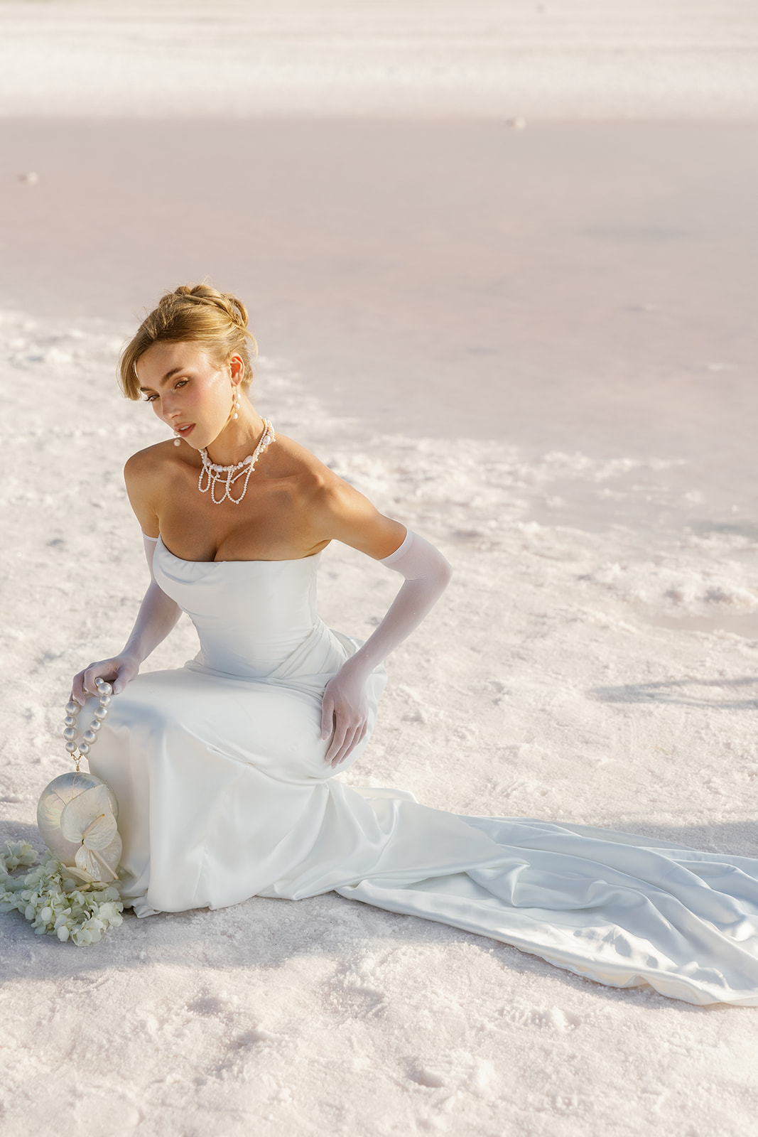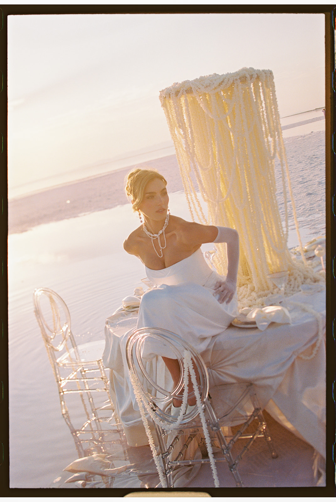 For this pink lake editorial, we leaned into the natural synergy between the siren aesthetic and the surreal desert landscape. The salt flats, with their mineral deposits creating soft pink and white textures, mimic the foam and crystalline quality of ocean shores. The sculptural floral installations echo coral formations and sea anemones, while the pearl jewelry and shell accents provide literal nods to underwater treasures. These elements combine to create unique bridal inspiration ideas that feel fresh yet deeply romantic. What makes this trend so compelling for fashion-forward brides is its versatility. The siren bride aesthetic adapts beautifully whether you’re planning an intimate beach elopement, a luxury desert ceremony, or even an unconventional urban wedding. The key elements remain consistent: luxurious textures, organic flowing lines, a connection to natural landscapes, and styling that feels editorial and intentional.