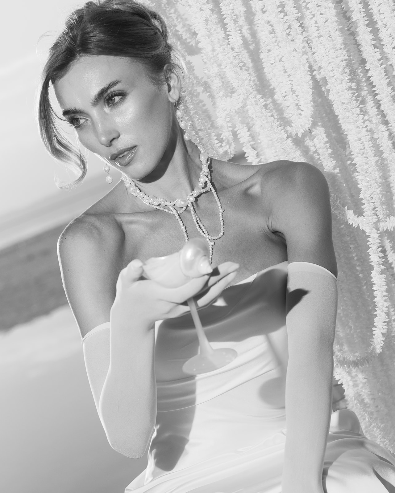 This approach to bridal photography moves beyond documentation into the realm of fashion editorial, and fine art. Every element, from the draping of fabric to the placement of pearls against salt-crusted earth, is composed with the same attention to detail you’d find in a high-fashion magazine spread. For couples seeking editorial wedding photography, the siren bride aesthetic offers endless creative possibilities while maintaining an inherently romantic and feminine foundation. It’s bridal inspiration that challenges you to reimagine what wedding imagery can be.