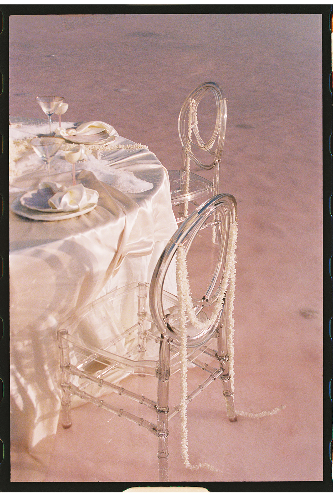 For this shoot, I chose to work primarily with Kodak Portra 400 and Portra 800, film stocks renowned for their ability to render rich, saturated pinks and soft, romantic skin tones. Film has an organic way of handling the intense desert light and the subtle color variations in the salt flats that digital sensors can sometimes render too clinically. Portra’s fine grain structure adds a textural quality that complements the natural textures of the crystallized salt and flowing fabrics, creating images that feel both contemporary and nostalgic. The pink tones of the water presented a unique challenge and opportunity. Digital photography allowed me to capture the scene with technical precision, ensuring perfect exposure in the high-contrast environment where bright salt reflects intense light against deeper pink water. Shooting on a digital system meant I could immediately review images and adjust for the tricky lighting conditions that desert landscapes present, ensuring we captured every critical moment. However, film brought an irreplaceable softness and depth to the color palette. Portra emulsions have a particular affinity for pink and coral tones, rendering them with a luminosity and dimension that feels almost three-dimensional. The way film captures the gradient from pale salt white to deeper rose in the water created a painterly quality that perfectly matched the siren aesthetic we were pursuing. Shooting both mediums also allowed me to work at different paces throughout the session. Digital provided the freedom to experiment, capture movement, and ensure we had technically perfect images. Film slowed me down, made me more intentional with each frame, and brought a meditative quality to the creative process that I believe translates into the final images.